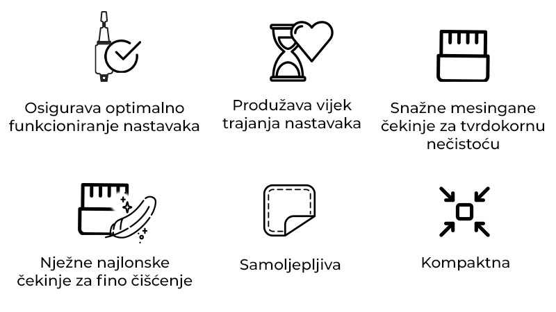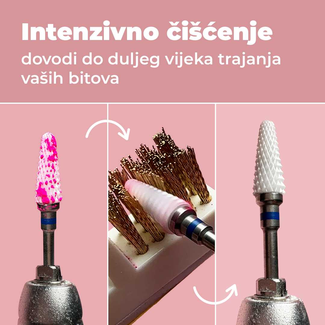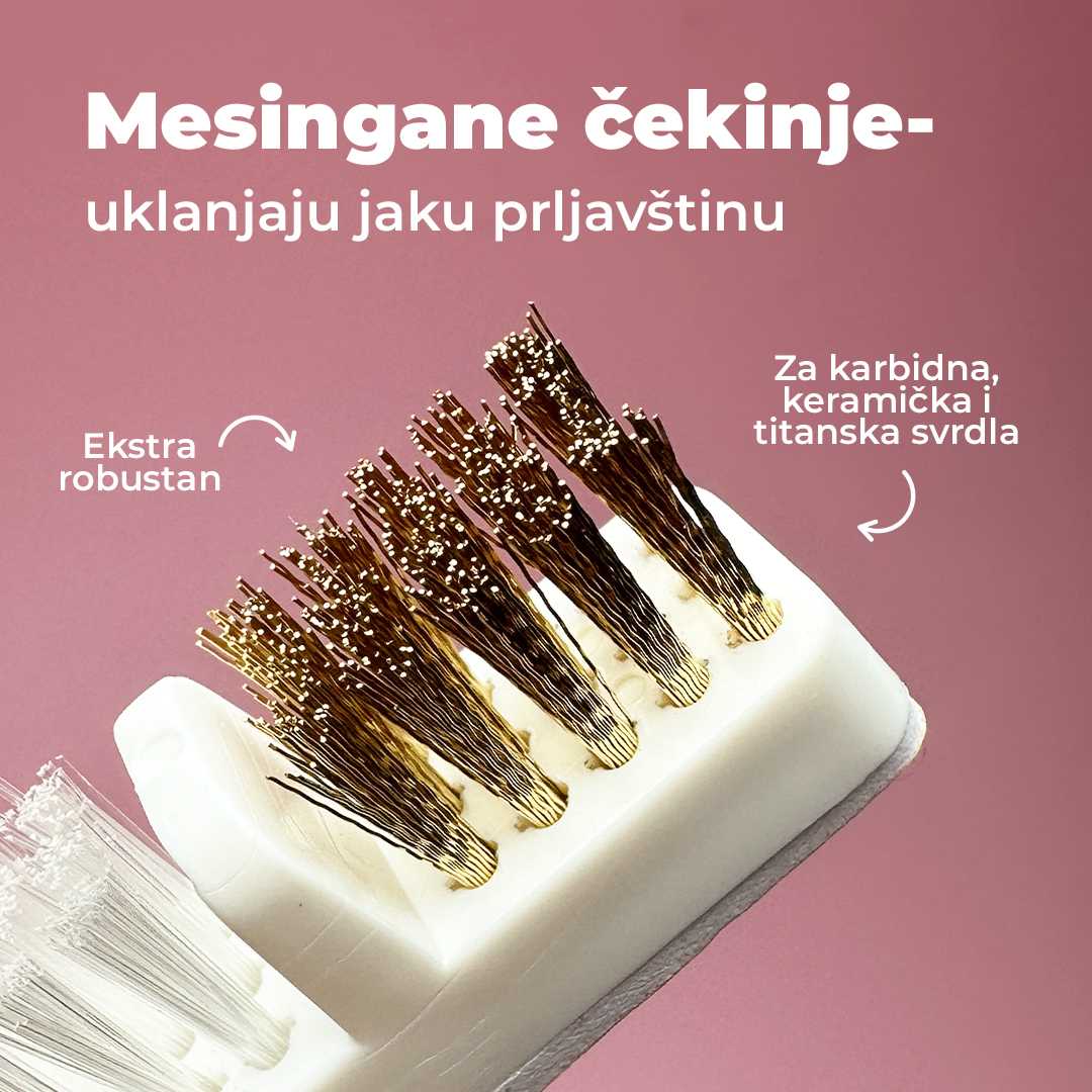 Sve! Za nastavke za frezu od karbida, keramike ili titana prvo možete koristiti mesinganu četku, a zatim najlonsku za naknadno čišćenje. Za dijamantne nastavke koristite samo najlonsku četku.