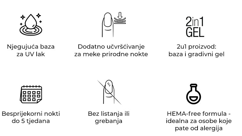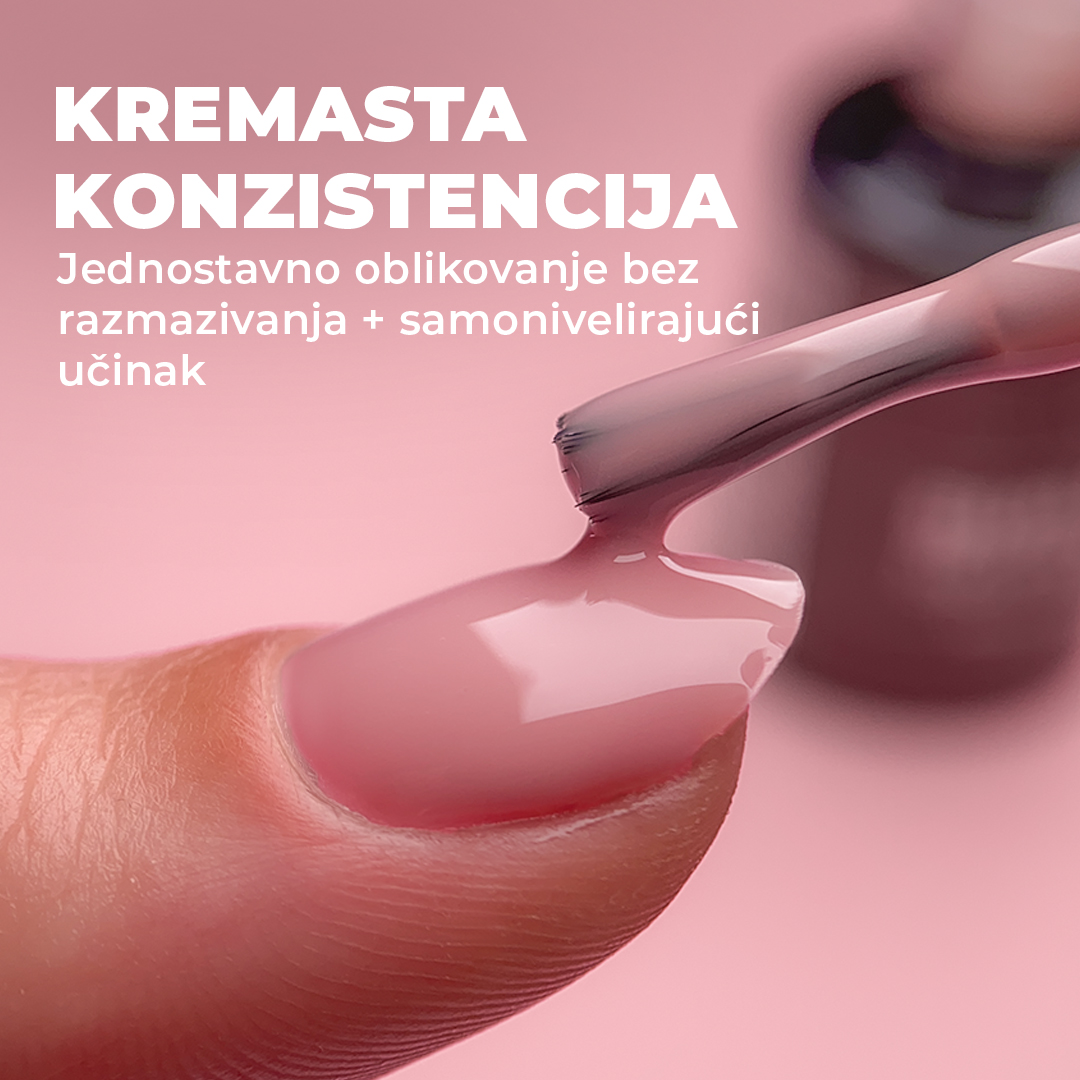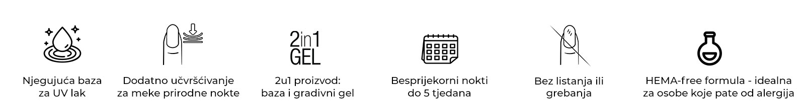Ovaj gel je pravi svestrani proizvod, kombinirajući prednosti baznog sloja za gel lak sa stabilnošću gradivnog gela. Može se nanositi kao tradicionalni UV lak ili koristiti za stvaranje stabilne, prirodne strukture noktiju.