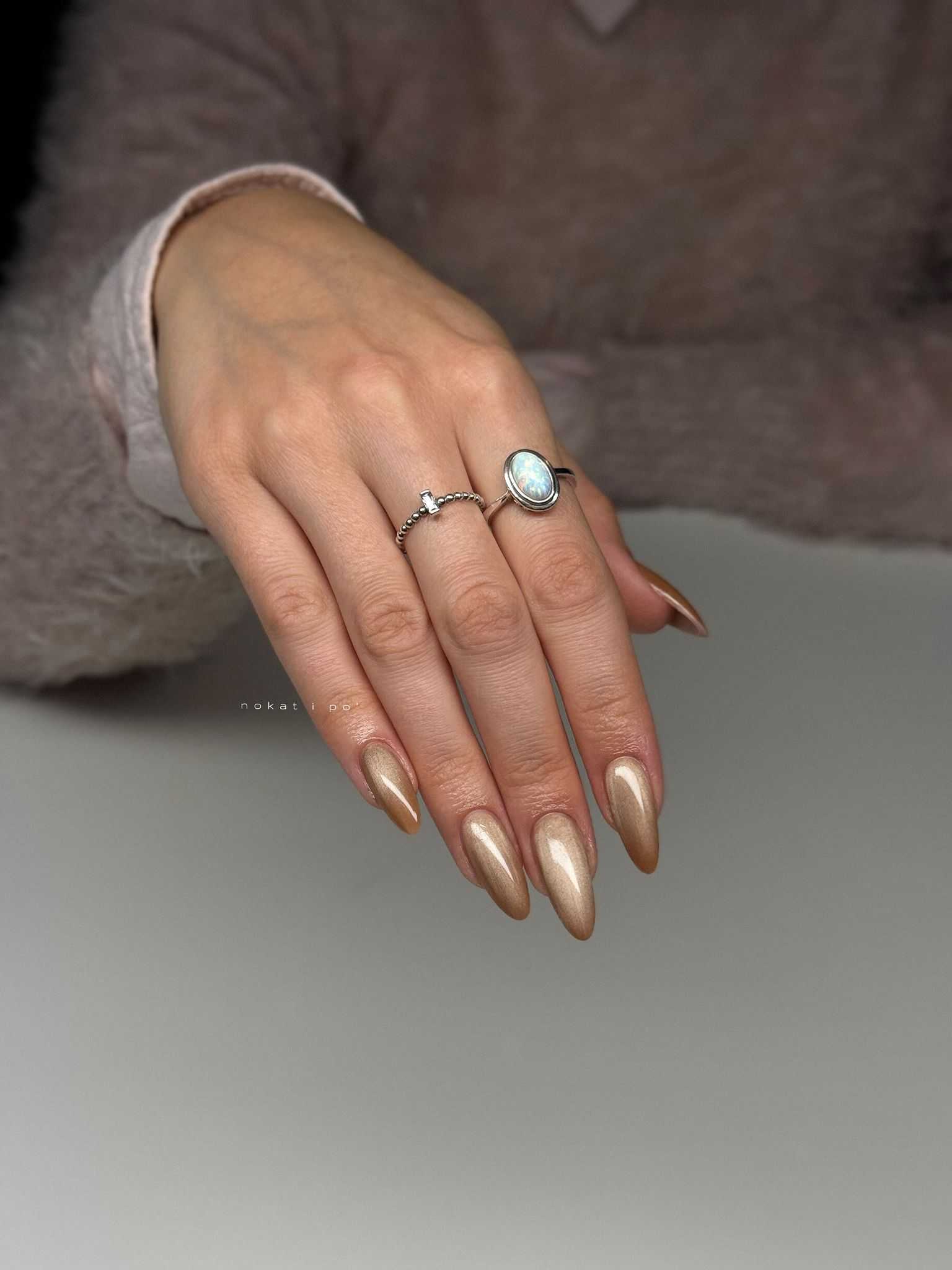 Naš Gel Lak Cat Eye Galaxy Latte je nježno smeđe boje s nježnim smeđim svjetlucavim pigmentima.