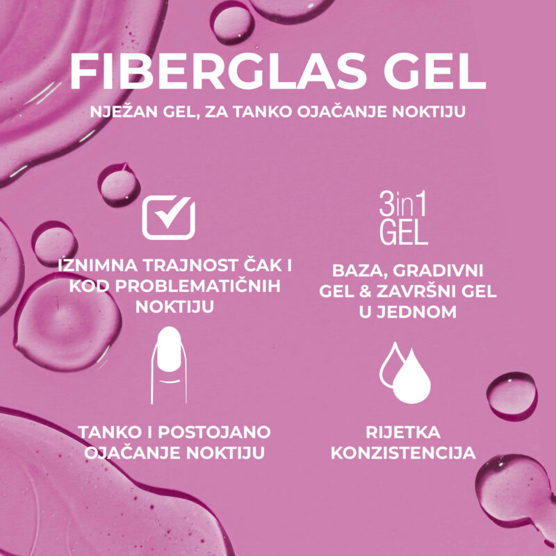 Ovaj Fiberglas gel idealan je za sve koji žele da im nokti izgledaju kao da su prirodno ojačani. Može se oblikovati vrlo tanko ili nanositi u više slojeva bez gubitka stabilnosti. Čestice od fiberglasa pružaju dugotrajno ojačanje, otporno na lomljenje– bez potrebe za opsežnim nanošenjem sloja.