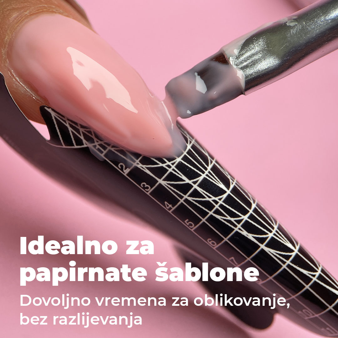 11. OPCIONALNO: Ako želite produžetak noktiju šablonom za modeliranje, stavite je ispod svog prirodnog nokta i oblikujte ekstenziju Jelly Allround gelom.