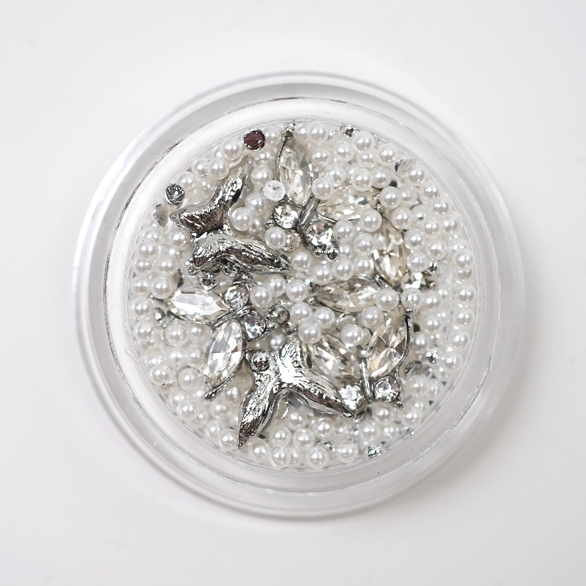 Naš Overlay Mix – Butterfly sadrži svjetlucave leptire, kamenčiće i bijele bisere. Ovim setom za nail art možete dočarati proljeće na svakom noktu!