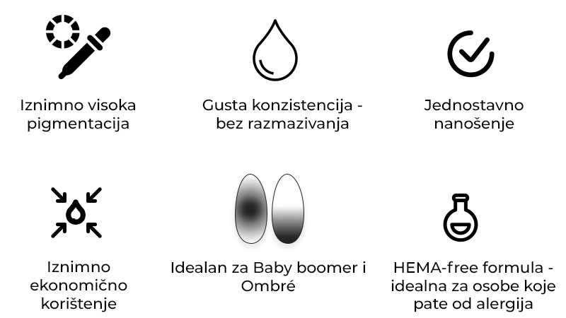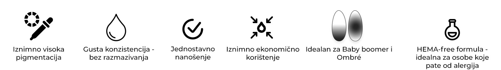 Ovdje smo se svjesno odrekli sastojka HEMA i zamijenili ga drugim alternativama. Tako i osobe sklone alergijama mogu stvarati prekrasne gradijente boja. A ono najbolje? Ne moraš raditi nikakve kompromise, jer i ovaj proizvod dobivaš u provjerenoj kvaliteti Juliana Nails.