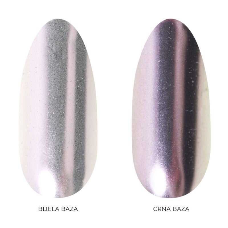 Glazed Aurora pigment – Cosmic: Na bijeloj boji, pigment svjetluca u srebrnoj boji s daškom roza nijansi, dok na crnoj boji impresionira nijansama srebrne, ljubičaste i roza boje.