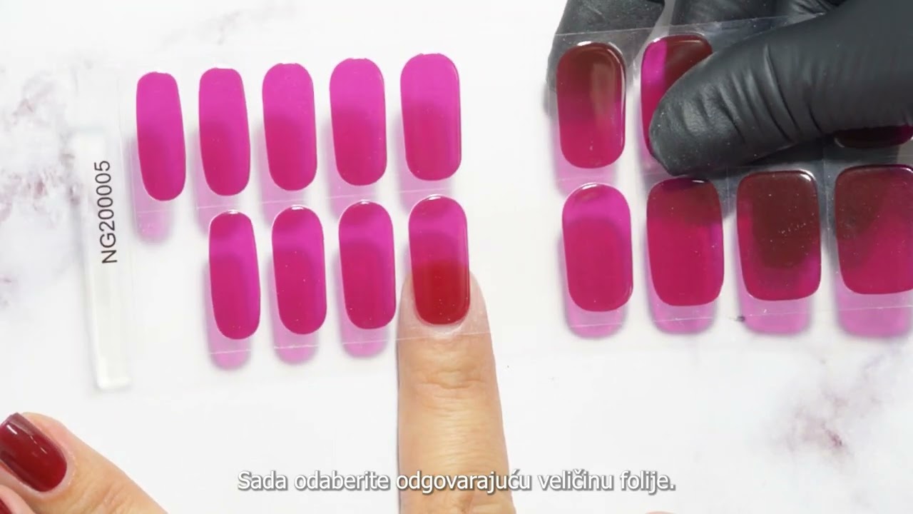 U svakom pakiranju samoljepljivih folija za nokte pronaći ćete 20 folija u različitim veličinama. Ako imate kratke nokte, možete koristiti jednu foliju za 2 nokta.