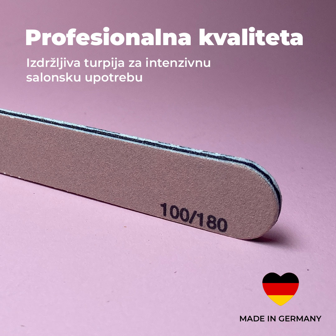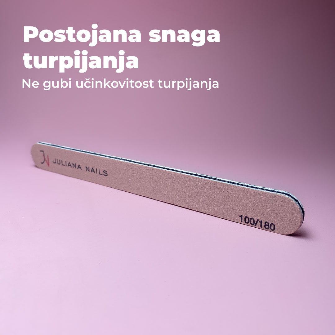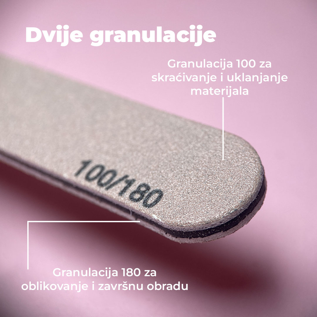 Granulacija 100 je pregruba. Praktičnija je za skraćivanje ili uklanjanje noktiju. Granulacija 180 može se vrlo pažljivo koristiti za pripremu prirodnih noktiju. Međutim, za poliranje prirodnih noktiju preporučila bih naše nježnije turpije za poliranje ili klasični blok za poliranje.