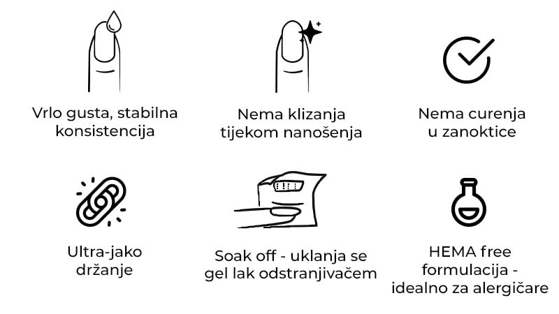 Što je posebno kod ovog gela? Ne trebaš špatulu, kist ni dodatne alate. Zahvaljujući super gustoj konzistenciji, gel možeš izravno uzeti iz posudice svojim Press-On tipom i postaviti ga na nokat. Bez kapanja, bez razlijevanja! Savršeno za čist i kontroliran rad.